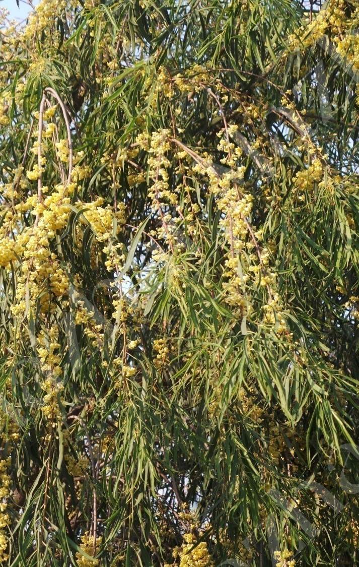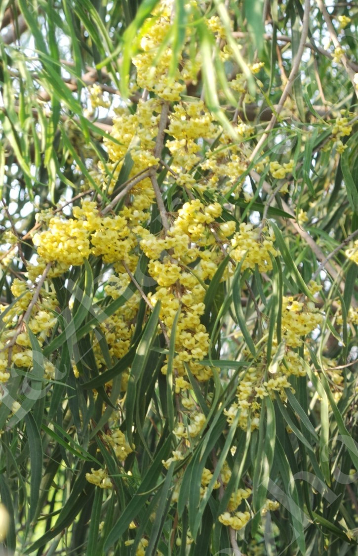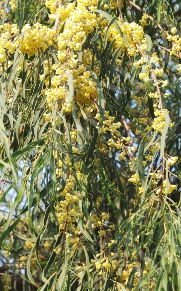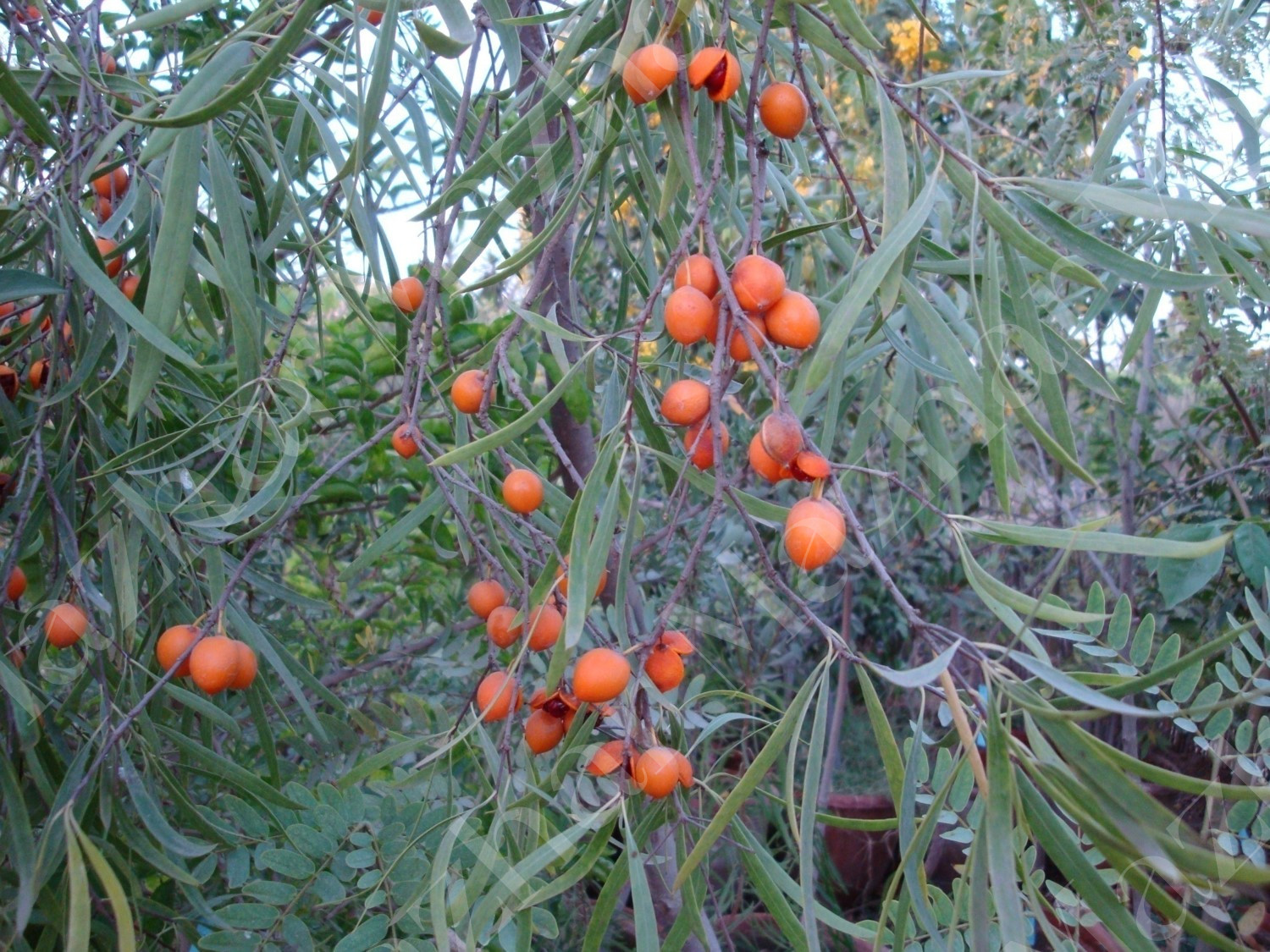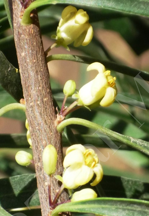Slow-growing, evergreen shrub or small tree, up to 10 m tall it has pendulous weeping branches leaves long and thin, 4-12 cm long, 04-12 cm wide flowers yellow tubular, fragrant fruit  small round orange , the wrinkled dark red seeds are held within a sticky yellow pulp