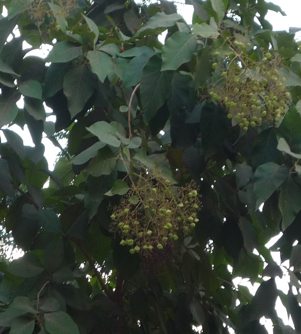 Deciduous large foliage tree to 50 m high in native leaves simple rich green to 30-75 cm long, broadly ovate, tomentose below, with long petioles flowers  fragrant, showy white, in terminal panicles fruit a drupe to 15 cm across light brown, hairy ball, contained in enlarged calyx