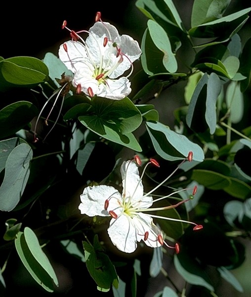 Semi deciduous small tree to 5 m high leaves silver to grey green flowers pure white, with a number of long spidery brilliant red stamens