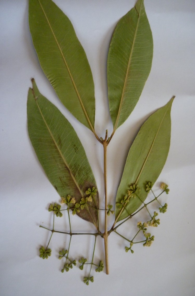 Evergreen tree to 15-24 m high, branchlets white or gray leaves elliptic or obovate to 12 cm long flowers white in axillary panicles fruit a berry, purplish-red ovoid to 15 cm long, edible, 1- seeded