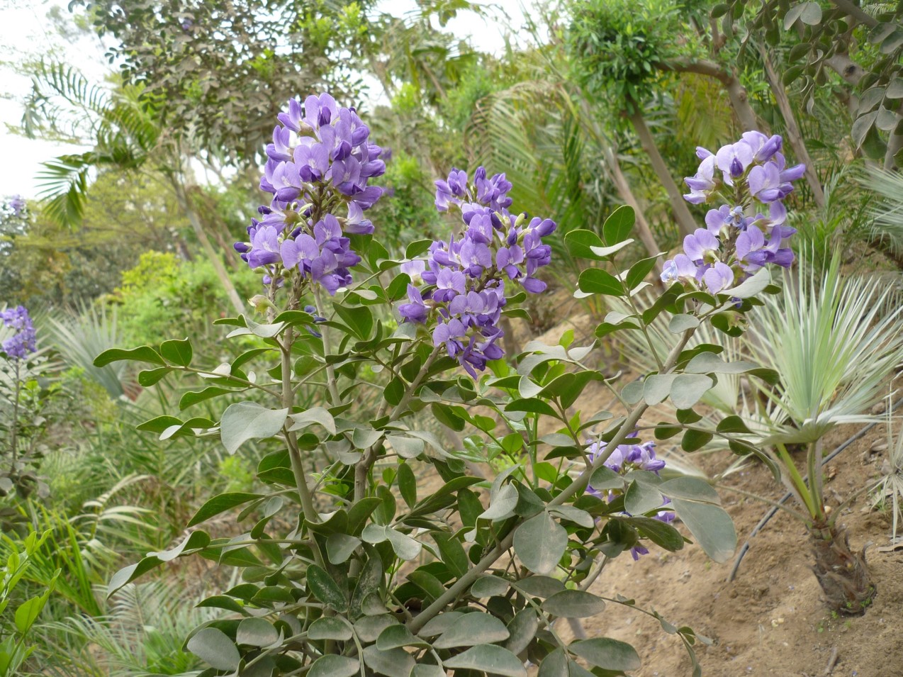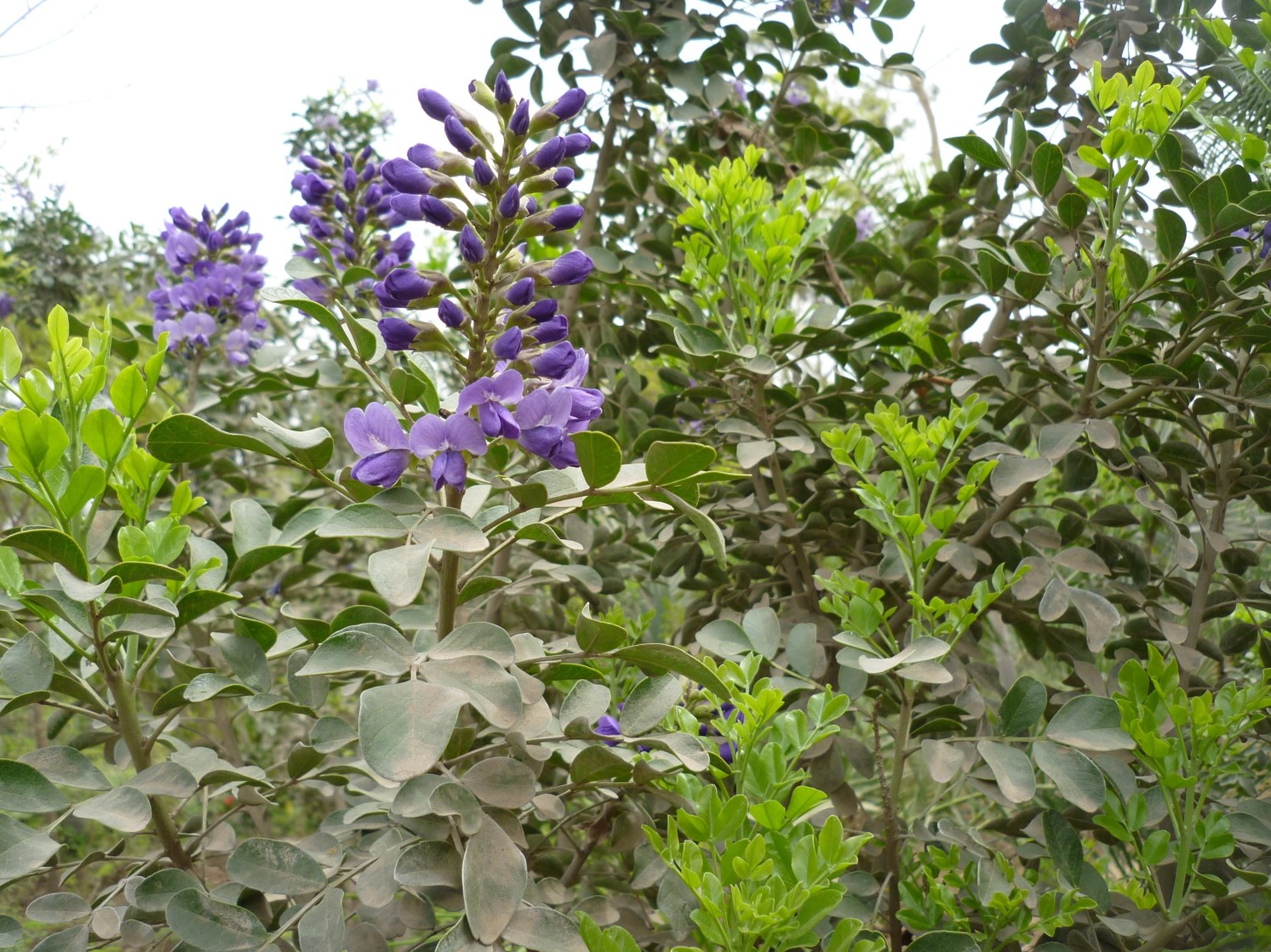 Evergreen shrub or small tree, growing  to 10 m tall leaves lustrous, leathery, dark green flowers  blue-purple, fragrant pods semi-woody with bright red poisonous seeds