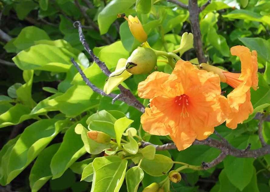 Evergreen tree grows to 7-10 m at maturity leaves ovate 8-20 cm long, 5-13 cm wide flowers orange fruit spherical 2-3 cm long, and woody when mature