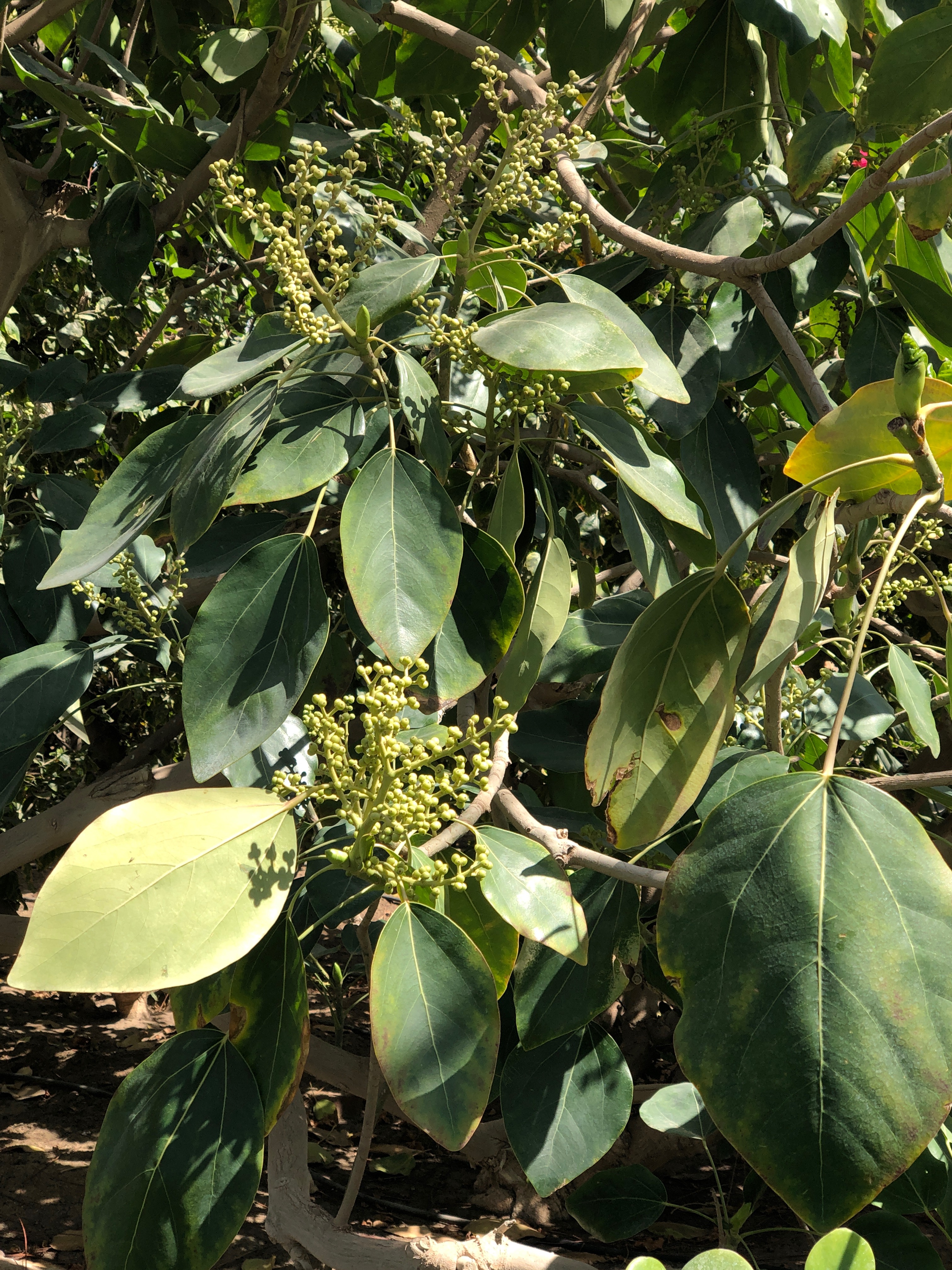 Small evergreen tree, growing to 45-9 m tall, leaves leathery oval glossy dark green on long petioles and with prominent veins and a pointed tip flowers white in terminal inflorescence