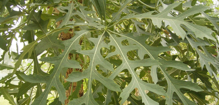Deciduous small tree up to 5 m tall Bark longitudinal fissured, thick and corky leaves leathery blue-green, digitately compound,leaflets up to 30 -60 cm, deeply lobed flowers fleshy, light green fruit purple-maroon