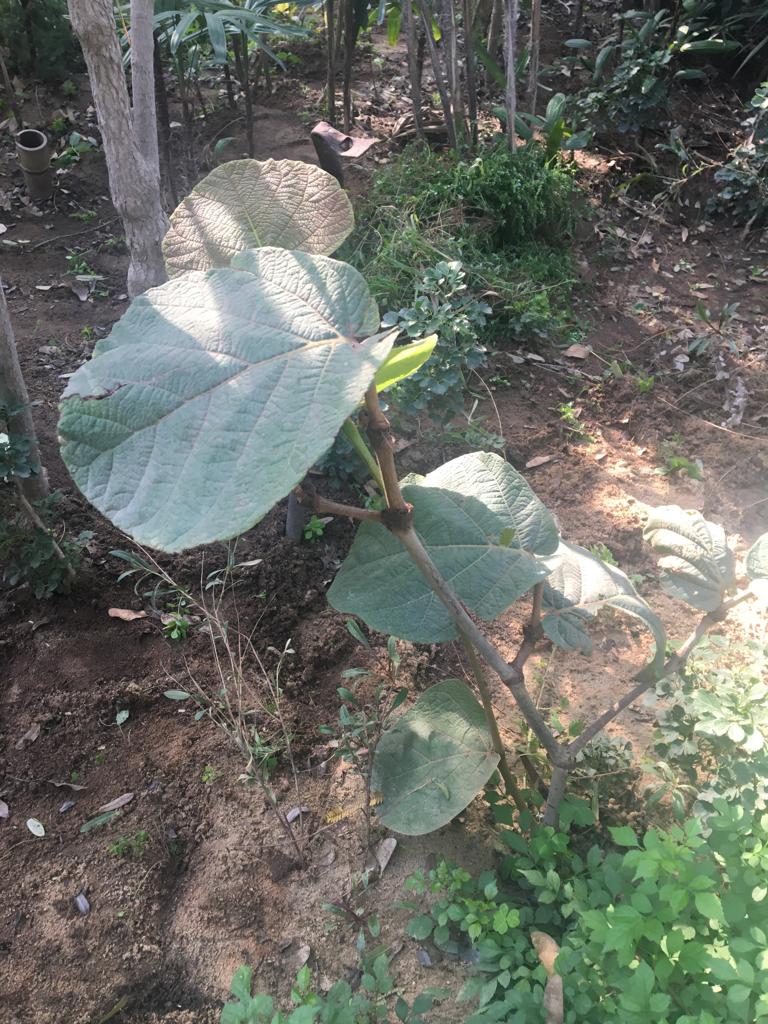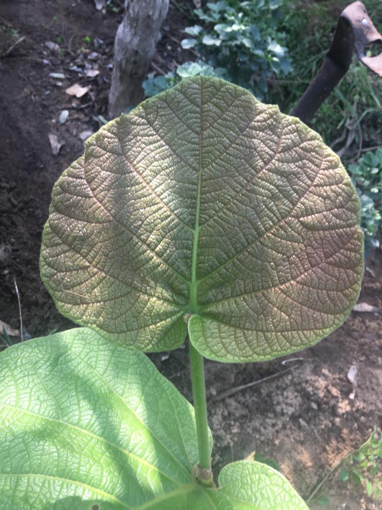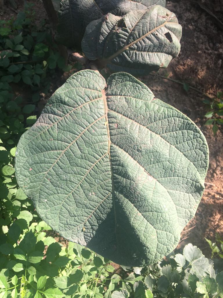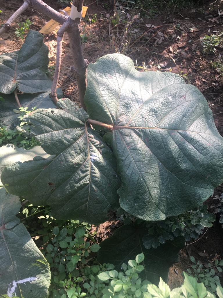 Evergreen tree growing to 24 m tall, leaves orbicular, very variable size from 10-45 cm diameter, bright green above, paler below with yellow to reddish veins, wavy margin flowers greenish-white, in erect spikes up to 60 cm long fruit 2 cm in diameter
