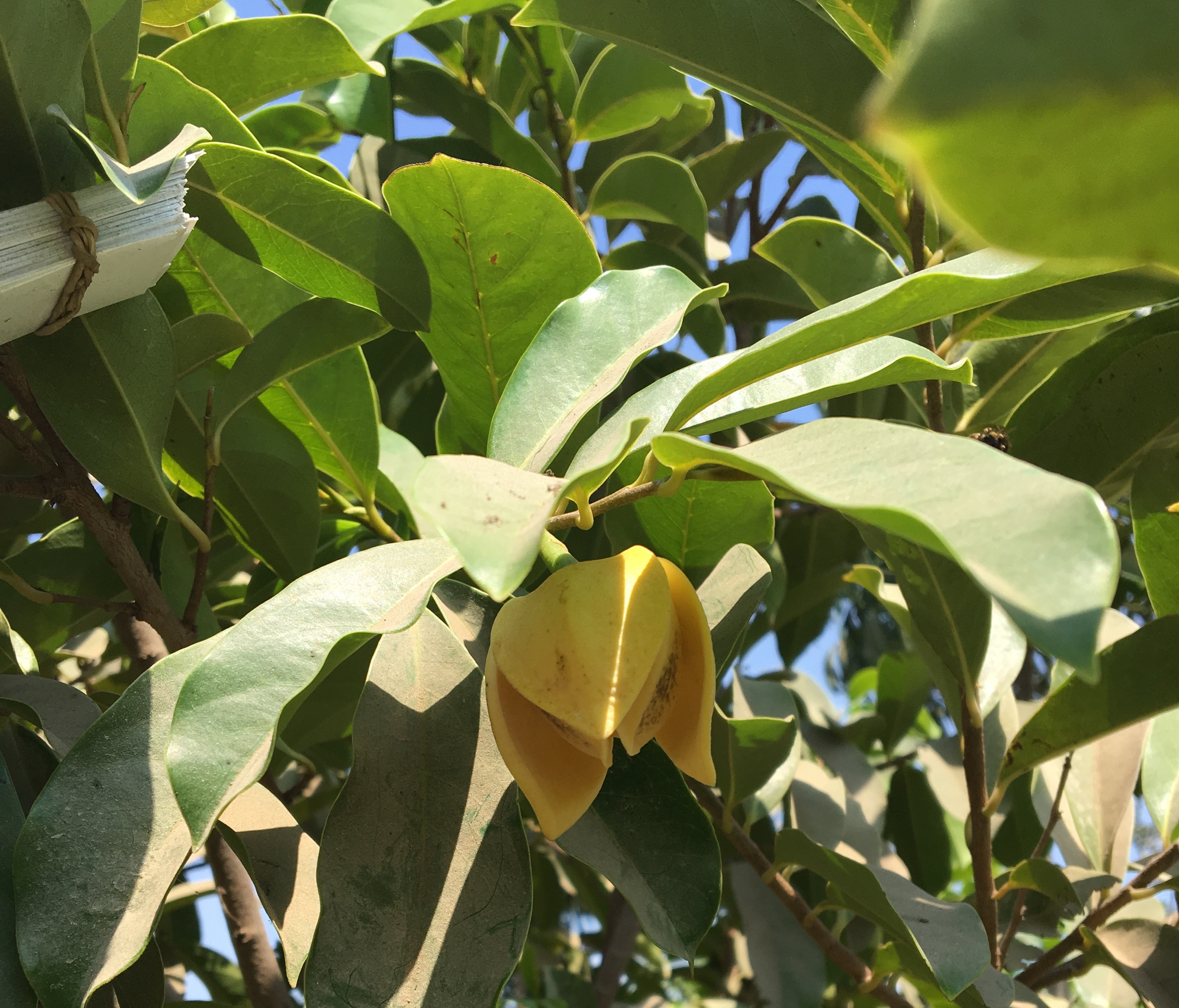 Evergreen tree grow 12 m tall leaves ovate to oblong, acute tip, 8-15 cm long, 4-6 cm broad flowers yellow or cream color of the petals fruit spherical and apple sized, 7-15 cm long, 9 cm diameter