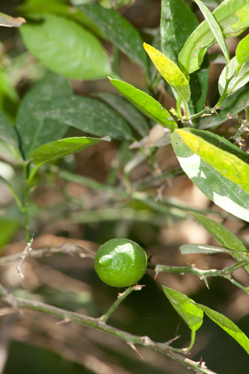 Small tree to 5 m, with many spines leaves ovate 25-9 cm long flowers yellowish white with a light purple ting on the margins fruit round, green to yellow, 3-6 cm in diameter, contains acidic juice vesicles