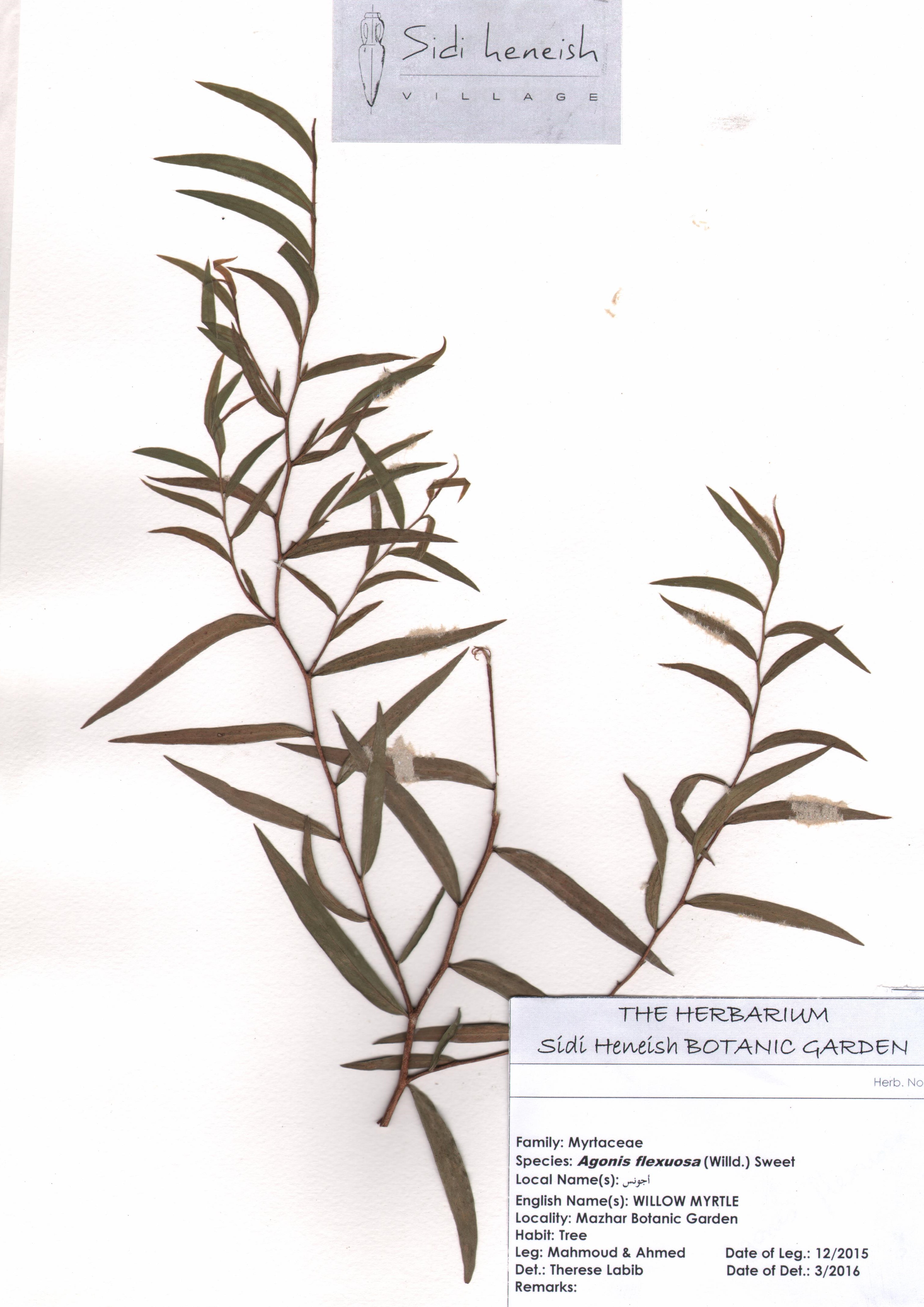 small tree grows in a weeping habit, up to 10 - 15 m tall Bark brown, fibrous leaves simple,  pendulous,  narrow long, dull green 15 cm long, young leaves red flowers white, small, fragrant fruit small brown capsule