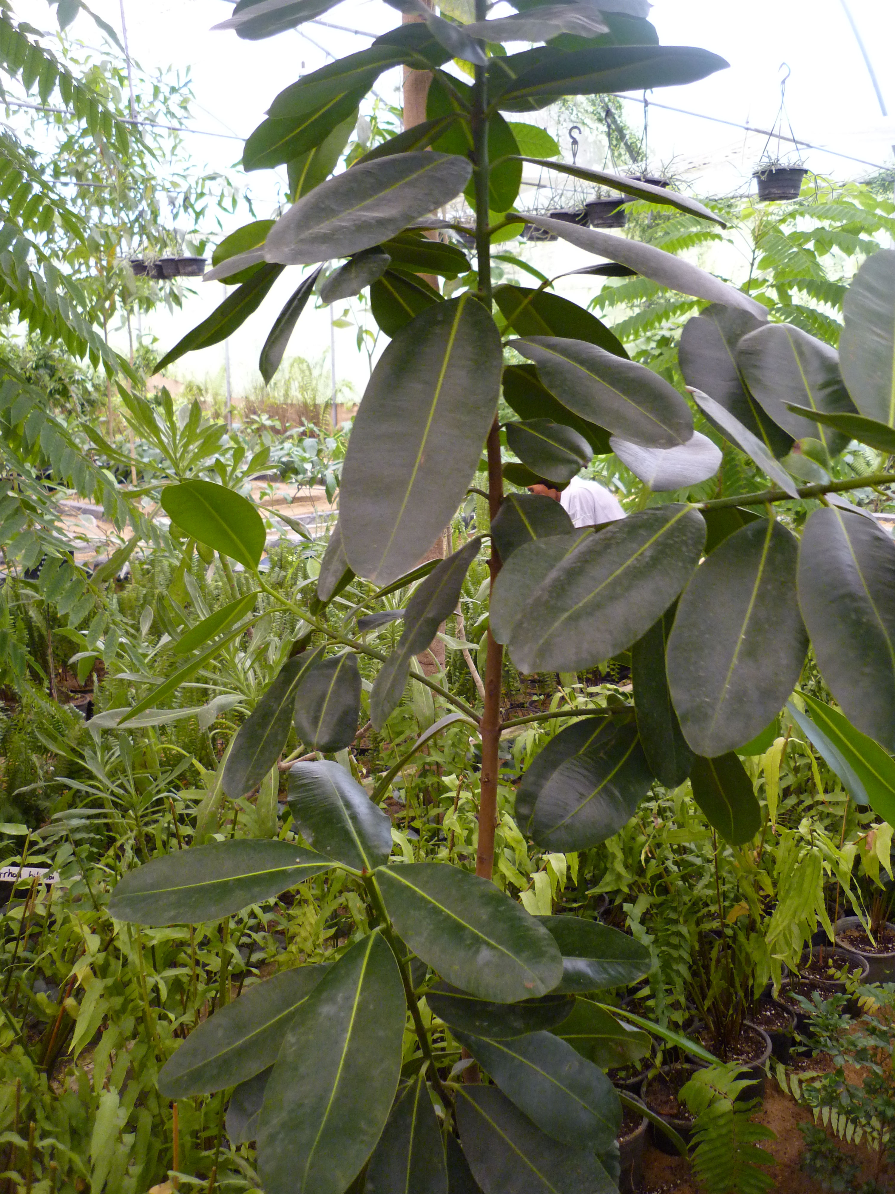 Evergreen tree with a spreading crown, grow up to 8-30 m high All pates of the plant contain a sticky yellowish latex leaves glossy, thick, elliptic flowers white scented