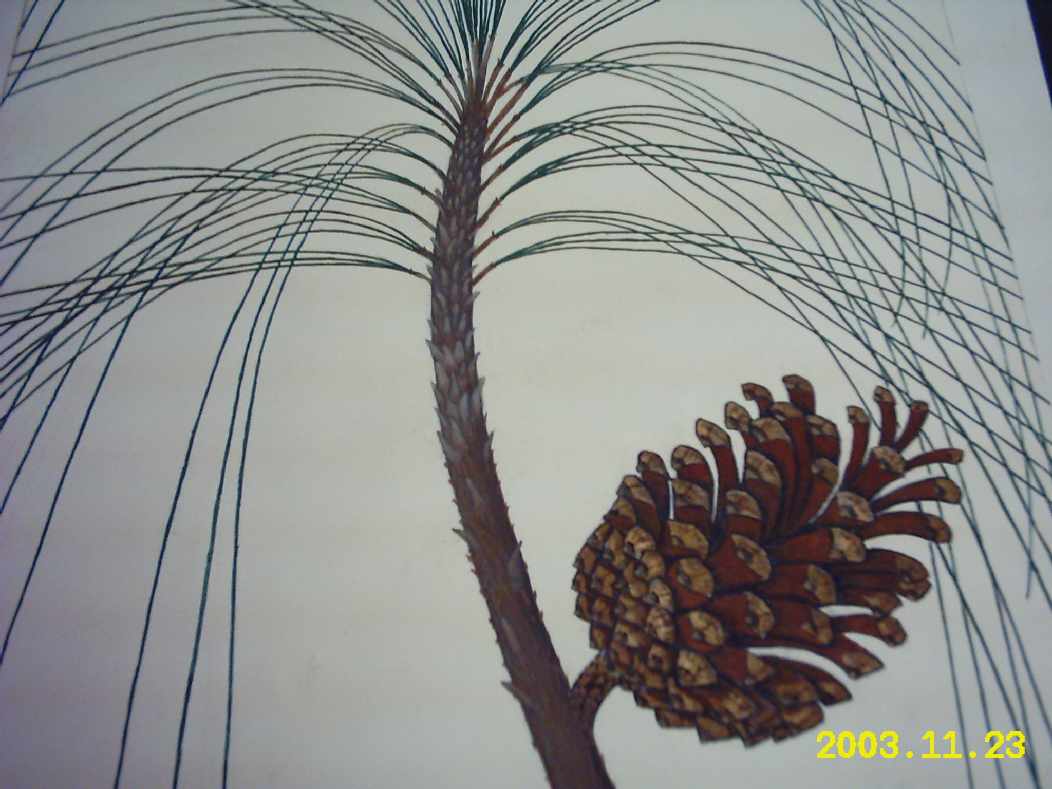 Evergreen tree grows up to 40 m tall , 120 cm in diameter leaves bluish green, drooping, needle-like, in bundles of three, 20-30 cm long cone 10-18 cm long, 5 cm wide