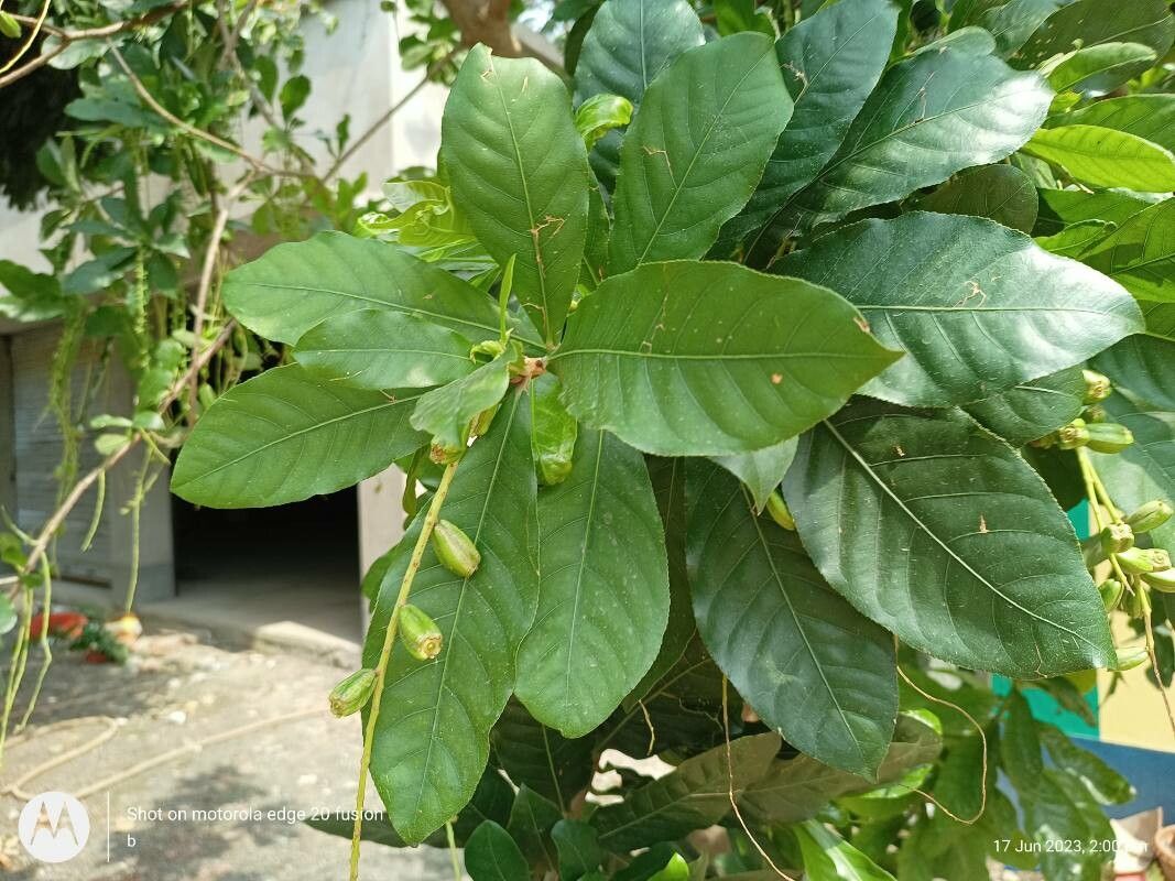 Evergreen tree grow about 8-15 m high leaves thick, smooth, oval inflorescence drooping raceme to 50 cm long, flower white, night- blooming fruit oval shaped 3 cm long, with 1 seed inside