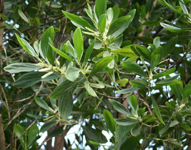 Evergreen tree grows up to 30 m tall, 60 cm in diameter leaves phyllodes flowers white in loose spikes, about 10mm long