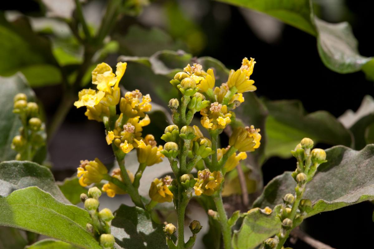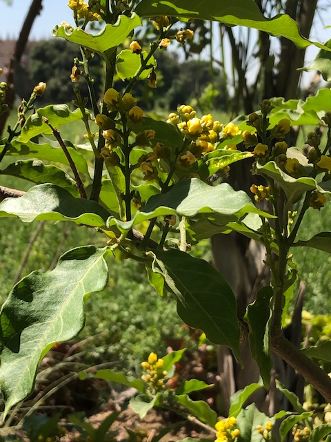 Evergreen small tree 5-10 m high leaves 8-12 cm long, simple and taper to the base flowers yellow in long racemes fruit edible, small red or orange, oval and fleshy, the consistency and texture of peanut butter