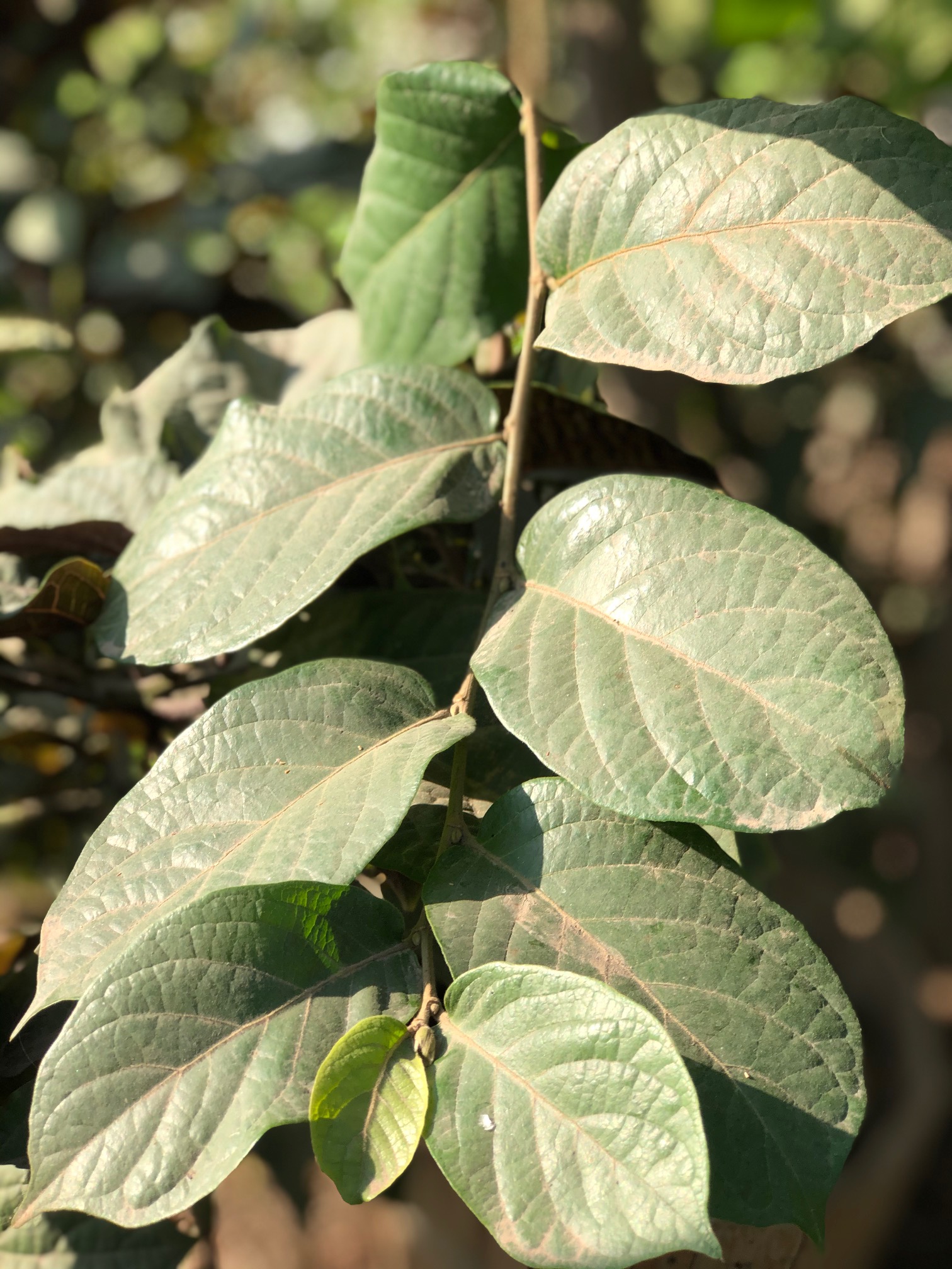 Evergreen to semi-deciduous shrub or small tree, dense, rounded crown grow to 2-15 m tall leaves simple alternate, 15 cm long leaf blade leathery dark glossy green, lower surface covered with rusty hairs and has prominent venation female flowers produced in thin catkins at the ends of twigs fruits small, fleshy, berry-like, green, then ripen to white, red, and finally purplish-black