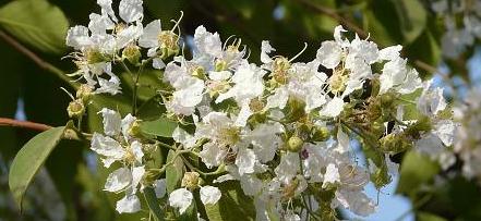 Semi deciduous tree grows to 20-25 m tall bark gray, fibrous leaves oblong-lanceolate densely covered with fine hairs underneath flowers white or pale pink borne in panicles fruit capsule, globose