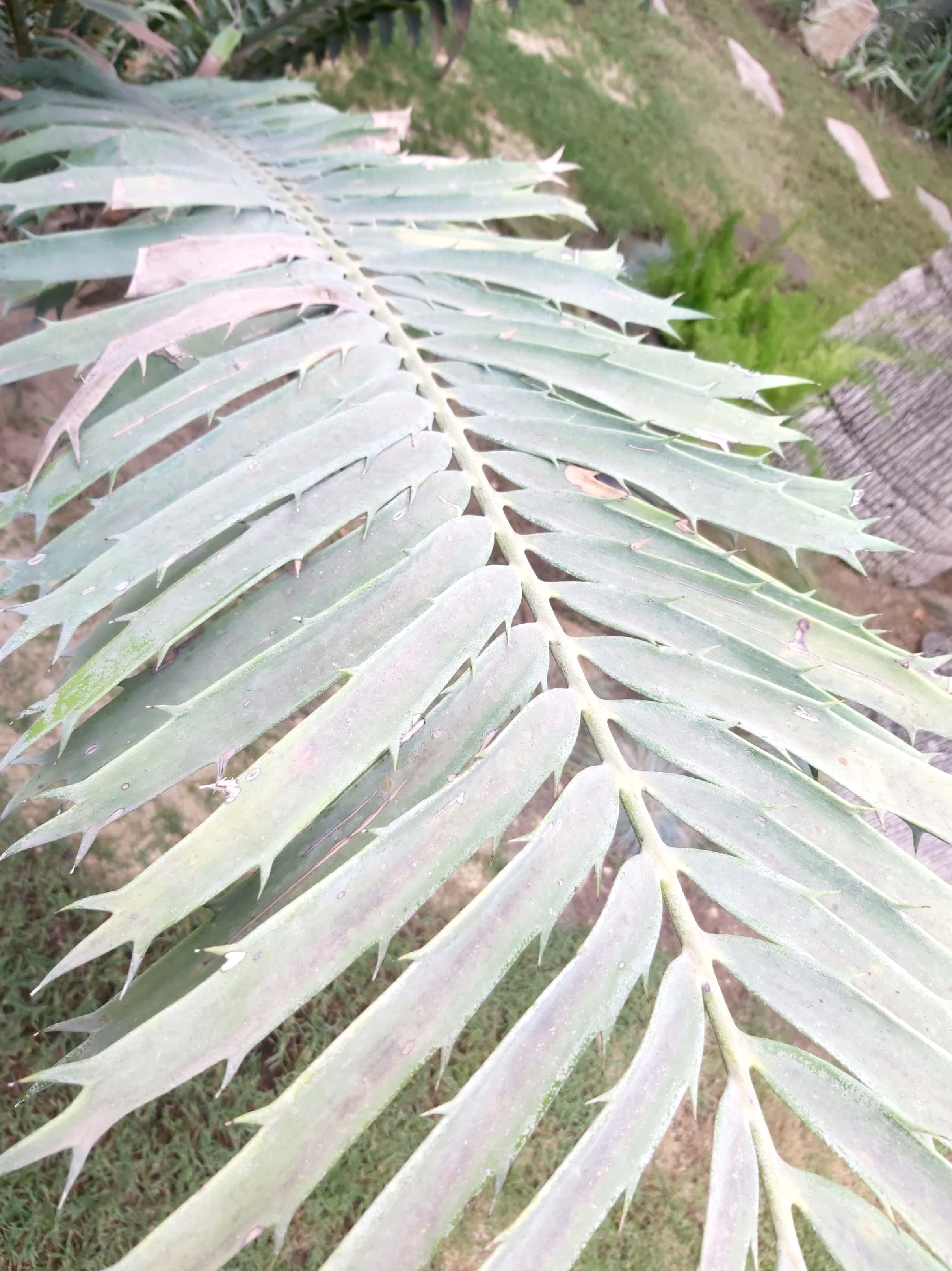 Dioecious cycad, 6 m high, 30 cm in diameter leaves pinnate 3 m long, leaflets leathery 20-35 cm long, 30 mm wide, with 2-3 spiny teeth at the end, margins with up to 9 spreading teeth female cones 1-4, cylindrical, 28-60 cm long, 15-25 cm in diameter male cones 1-7 spindle shaped 20-50 cm long, 5-9 cm in diameter
