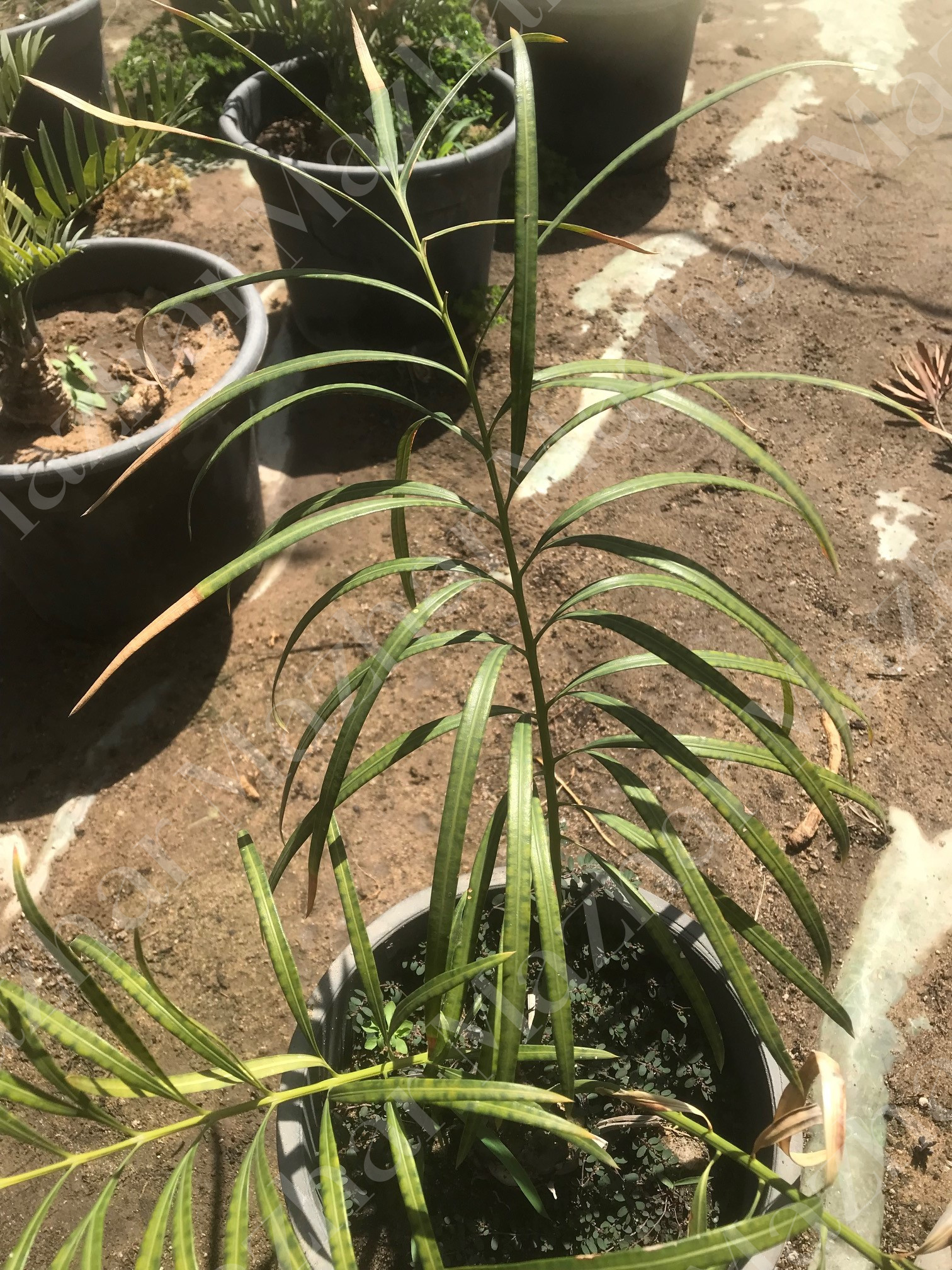 While its trunk is short, subterranean  20 cm  in diameter,  leaves tripinnate are probably the most fantastic among the cycads and readily distinguish it leaves are deep green, glossy, and can reach an amazing 25 to 3 m long leaflets 55 cm long , "fingers," giving the leaf a very full and bushy appearance