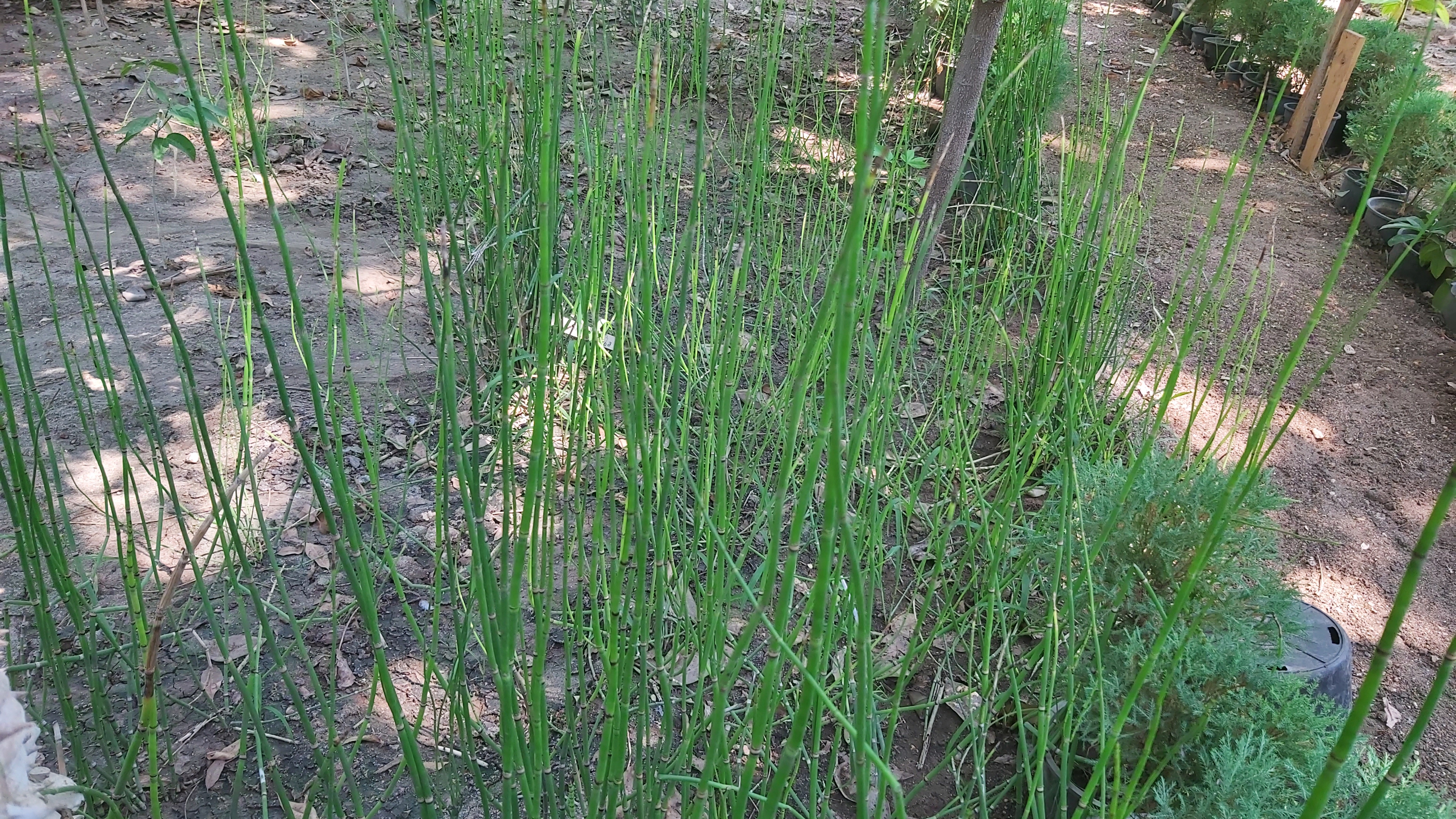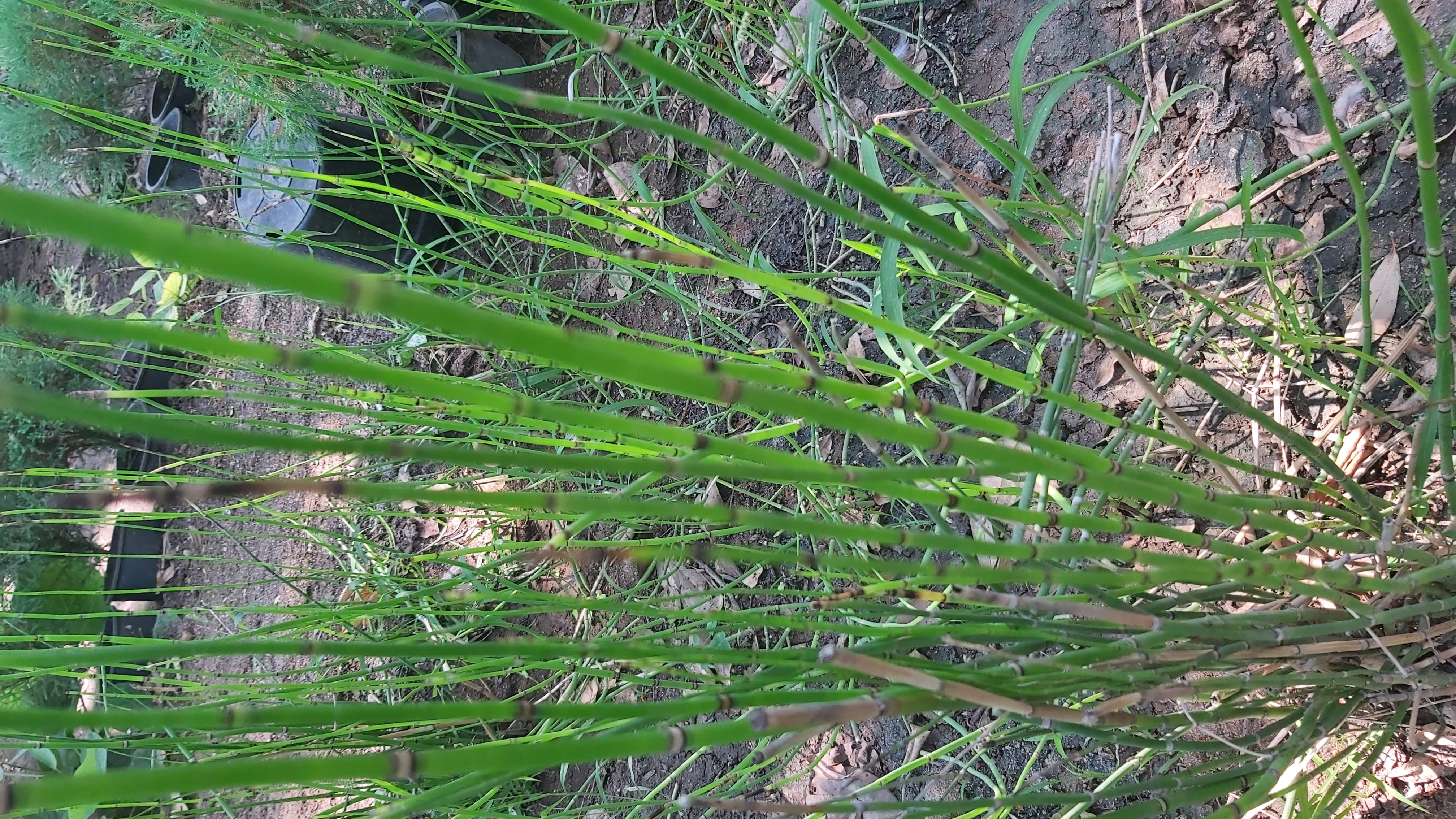 Evergreen perennial, known for its distinctive, jointed, reed-like stems, these stems dark green, rough and have a bamboo-like appearance with vertical ridges