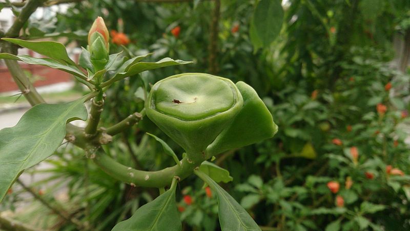 Deciduous shrub or small tree grow 2-8 m tall trunk 15 cm in diameter leaves green olive, arranged alternately on the branches, leaf blade 6-20 cm long and 2-7 cm wide, elliptic to oblong in shape Long thorns on the branches are up to 5-10 mm long flower red, orange, salmon pink fruit conical, truncated in the apex