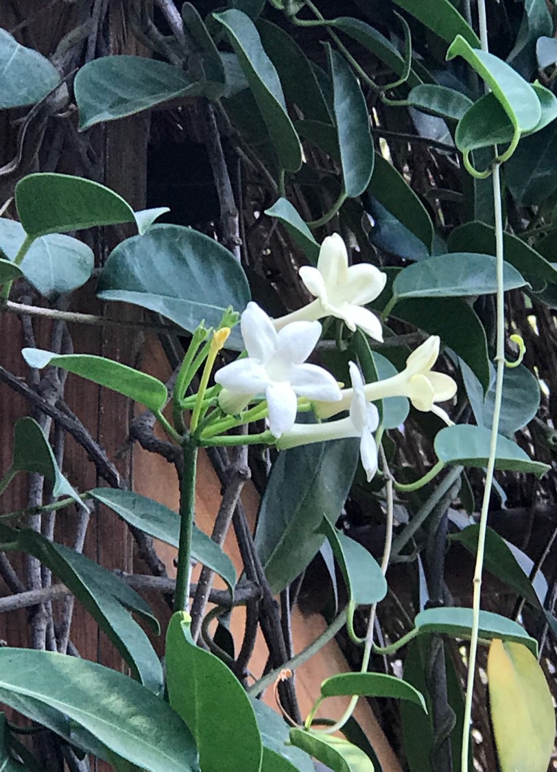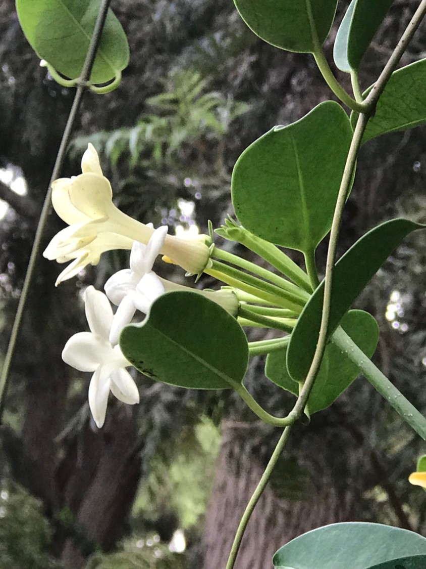 Evergreen woody climber to 4-6 m tall leaves oval to oblong-elliptic, thickly coriaceous flowers pure white, highly fragrant