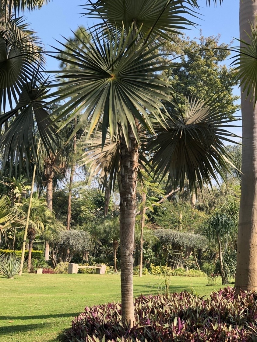 Solitary trunk grow 2-6 m tall leaves: fan, dark blue-green above and silver-coloured below flowers  are white and small on light orange branches fruit: globose and half an 25 cm in diameter