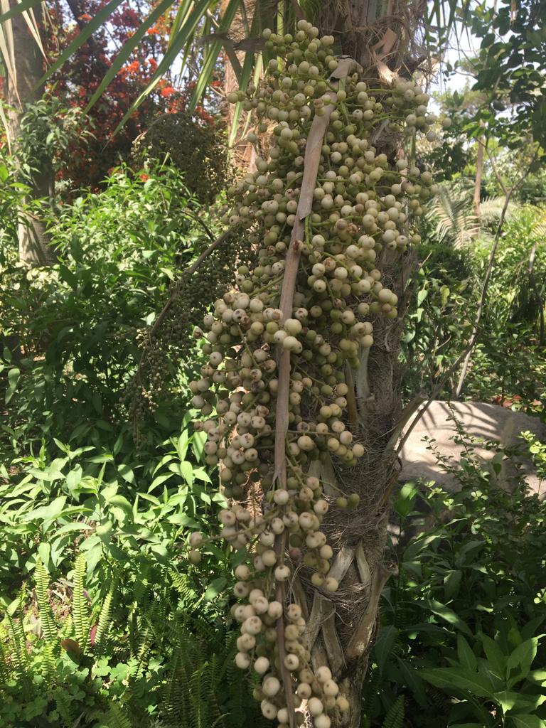 Solitary stemmed,  grows up to 11 m high, 35 cm in diameter leaves  fan-shaped, pale blue green, whitish on the undersides the inflorescences  extend the leaves and 55-100cm long fruit white, turn yellow as they mature