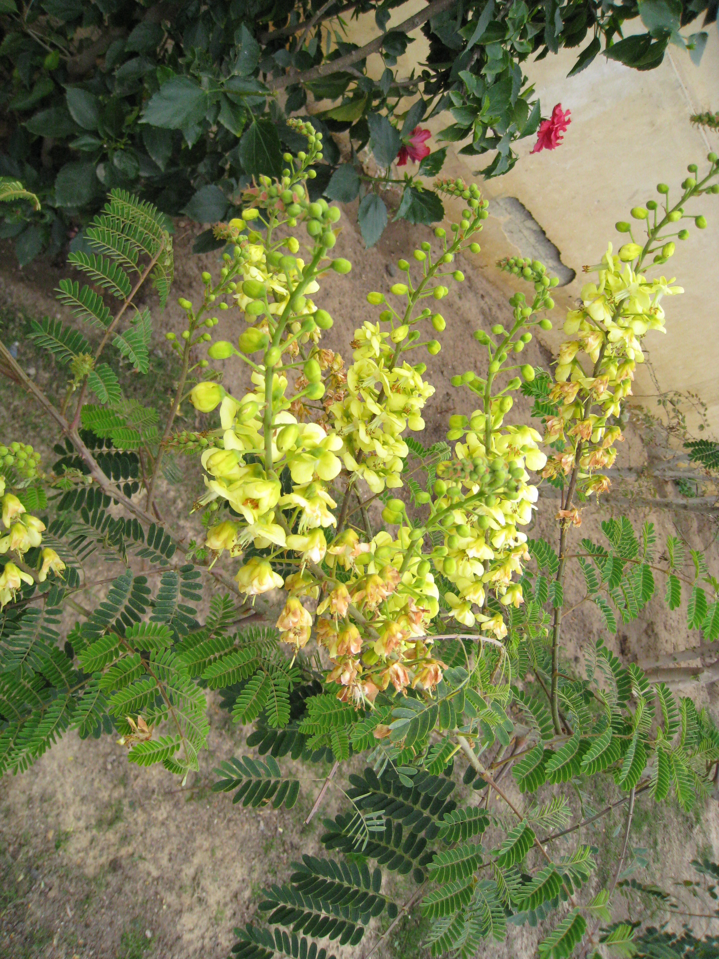 Evergreen shrub 2-4 m high, stem covered with minute golden hair and thorns straight to hooked leaves bipinnate dark green, paler beneath flower pale yellow, erect  clusters fruit woody pods, flattened, 8 cm long