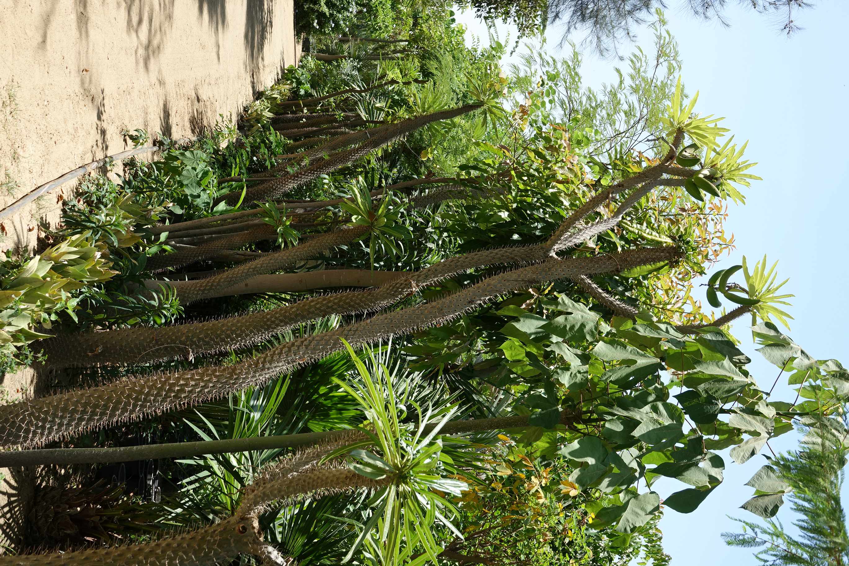 Semi deciduous or deciduous, succulent stemmed tree, 3-6 m tall stem spiny, trunk 30 cm in diameter leaves simple, green, lanceolate, arranged spirally mostly just at the top of the plant Petiole up to 4 cm long flowers salverform, white with yellow centre fruit pods 15-20 cm long