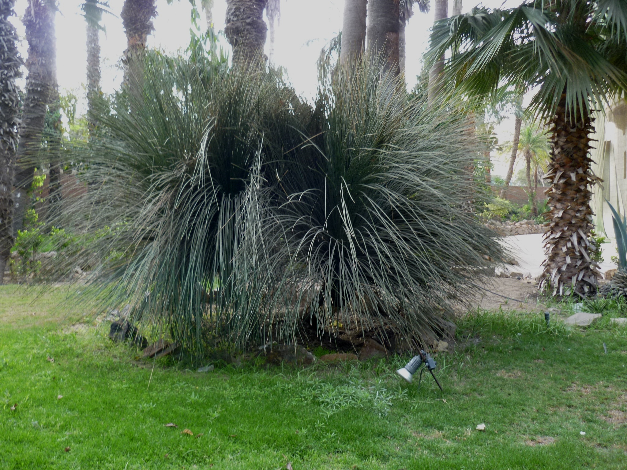 Plant dioecious, woody perennials with upright reclining trunks to 2-3 m tall leaves 80-140 cm long, 1-12 cm wide at base rigid glaucous-green narrow grass-like, smooth edges, spreading symmetrically in all directions from the trunk flowers white very small
