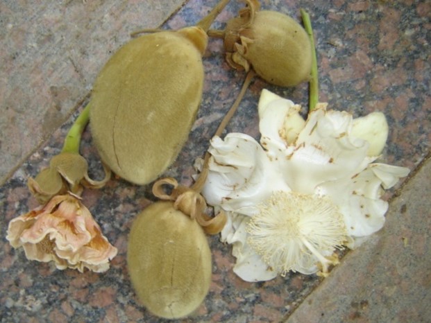 Deciduous tree to 5-25  m tall, trunk may reach a diameter 10-14 m Leaves: palmately compound 5-7 leaflets  Flowers white, showy and sometimes paired, but usually produced singly at the end of a 15-90 cm long hanging stalk fruit large, conical, indehiscent, woody, seeds kidney-shaped with a 06 mm thick coat