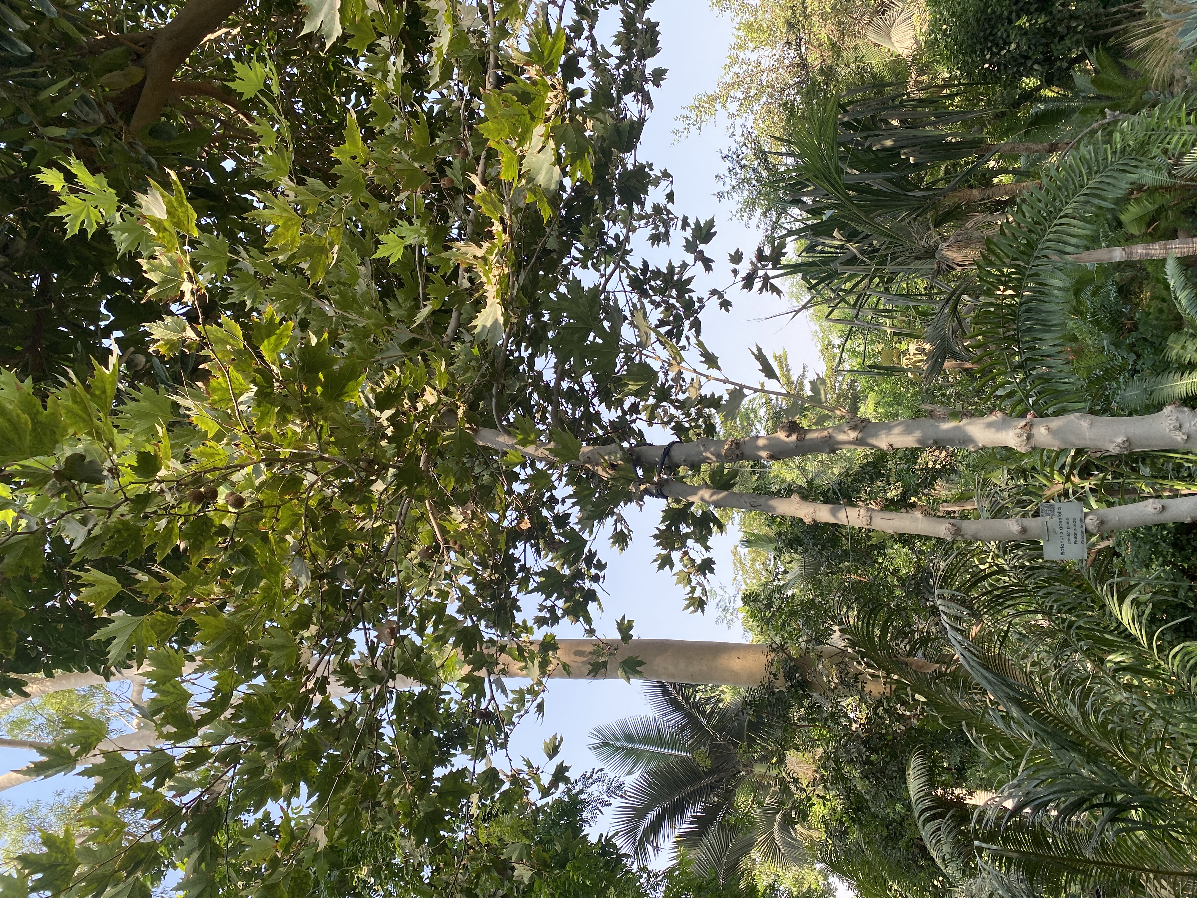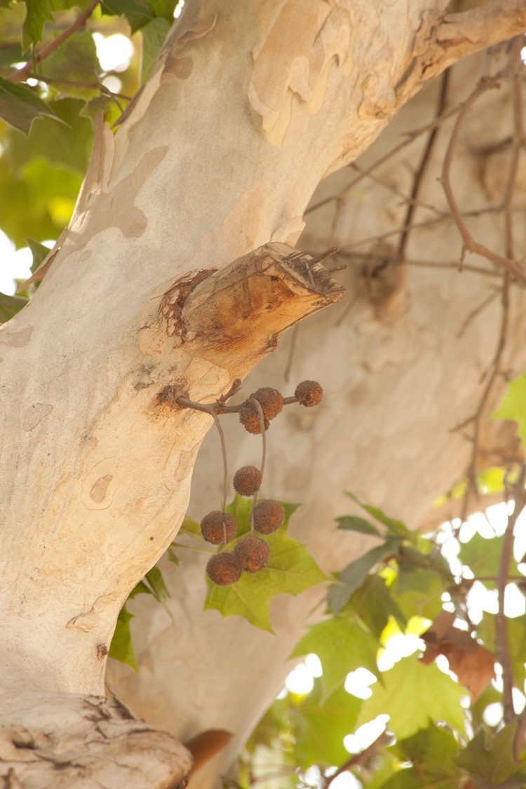 Deciduous tree growing 20-30 m tall the bark is usually pale grey-green leaves  thick, broad, palmately lobed (Maple-like) flowers borne in one to three (most often two) dense  spherical inflorescences on a pendulous stem, with male and female flowers on separate stems