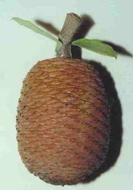 Evergreen conifer tree growing straight, 30-50 m tall, with smooth , scaly bark leaves leathery,  simple 5-12 cm long, 2-5 cm broad The seed cones  globose, 8–13 cm diameter, and mature in 18–20 months after pollination