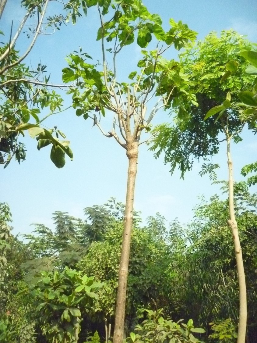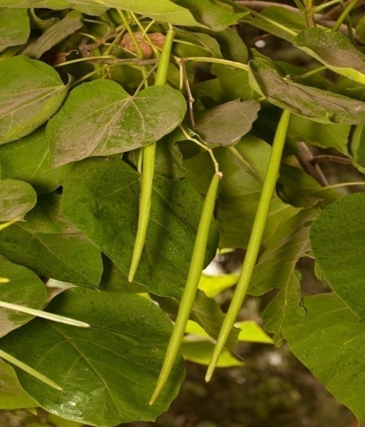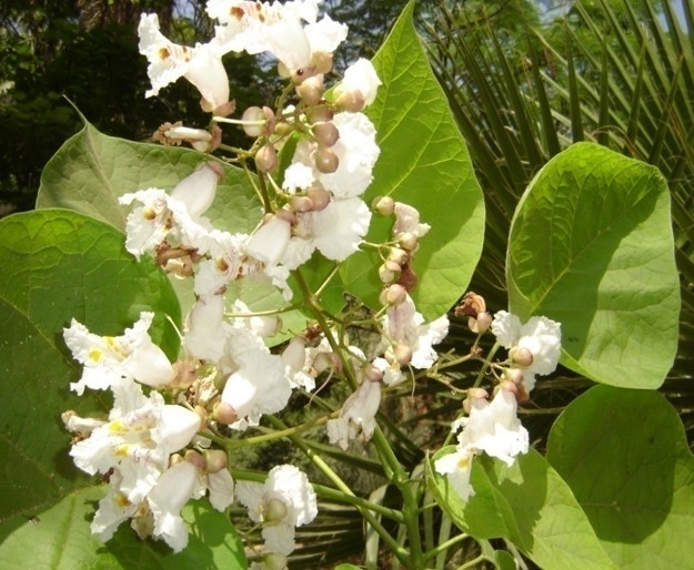 Deciduous tree growing to 15-18 m tall, 1 m in diameter leaves heart shaped, 20-30 cm long, 15-20 cm broad flowers trumpet shaped, white with yellow spots inside, grow in panicles fruit pod 20-40 cm long, seeds papery