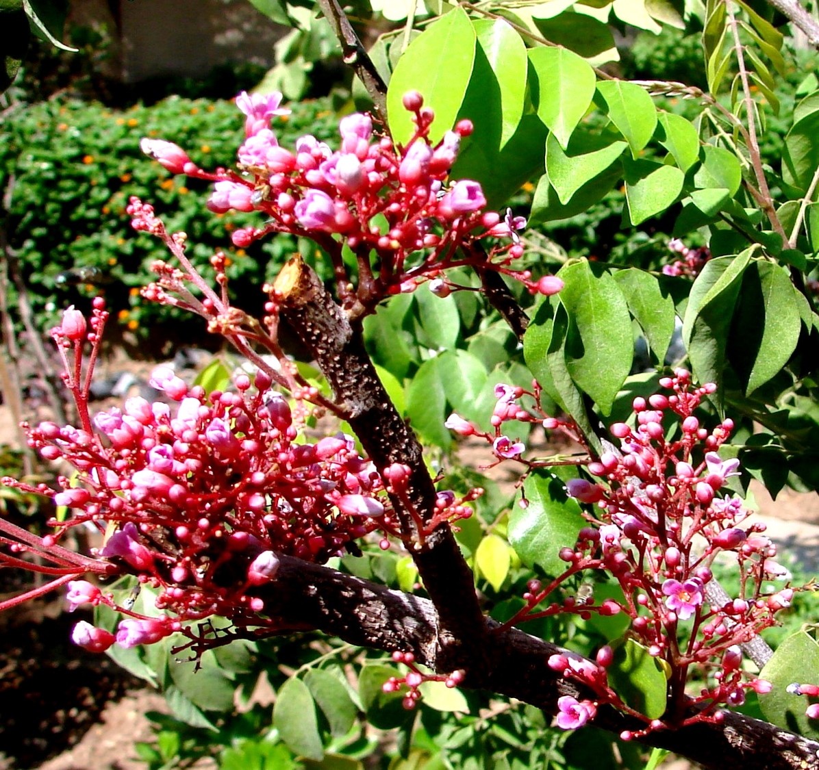 Shrub or small tree growing  5-10 m tall leaves compound, leaflets 5-11 nearly opposite, ovate-oblong flowers lilac or purple –streaked, arranged in small clusters on the ends of  the branches or sometimes on the larger stems and trunk, each cluster is attached to the tree with red stalks fruits edible, showy with an oblong shape: they are longitudinally 5- to 6-angled and 635–15 cm long and up to 9 cm wide
