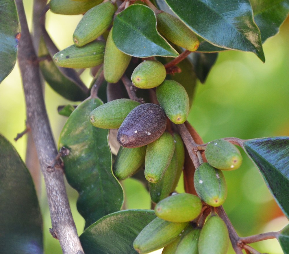 Evergreen shrub or small tree, 3-5 m high, 30 cm in diameter leaves alternate, ovate, 3-11 cm long flowers small creamy yellow fruit dark purple when ripe and have a gum-like skin that covers an inner whitish flesh They resemble an olive in size The fruits are edible, albeit very chewy They have several black seeds