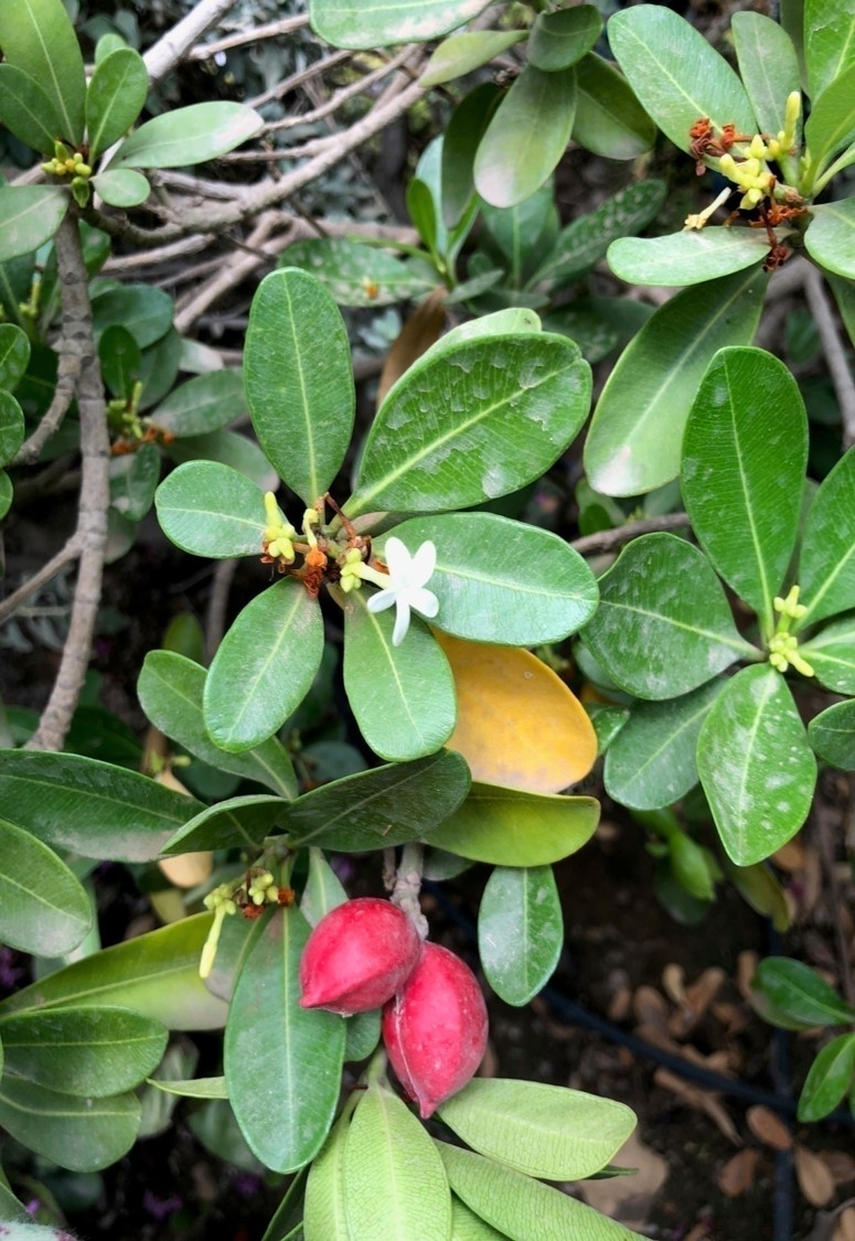 Evergreen shrub or small tree, growing 4-6 m tall leaves simple, leathery dark green elliptic to obovate 8-20 cm long and 4-8 cm wide flowers  white, small, fragrant fruit  toxic , drupe, red, ellipsoid with pointed apex, 3-6 cm long, 2-4 cm in diameter