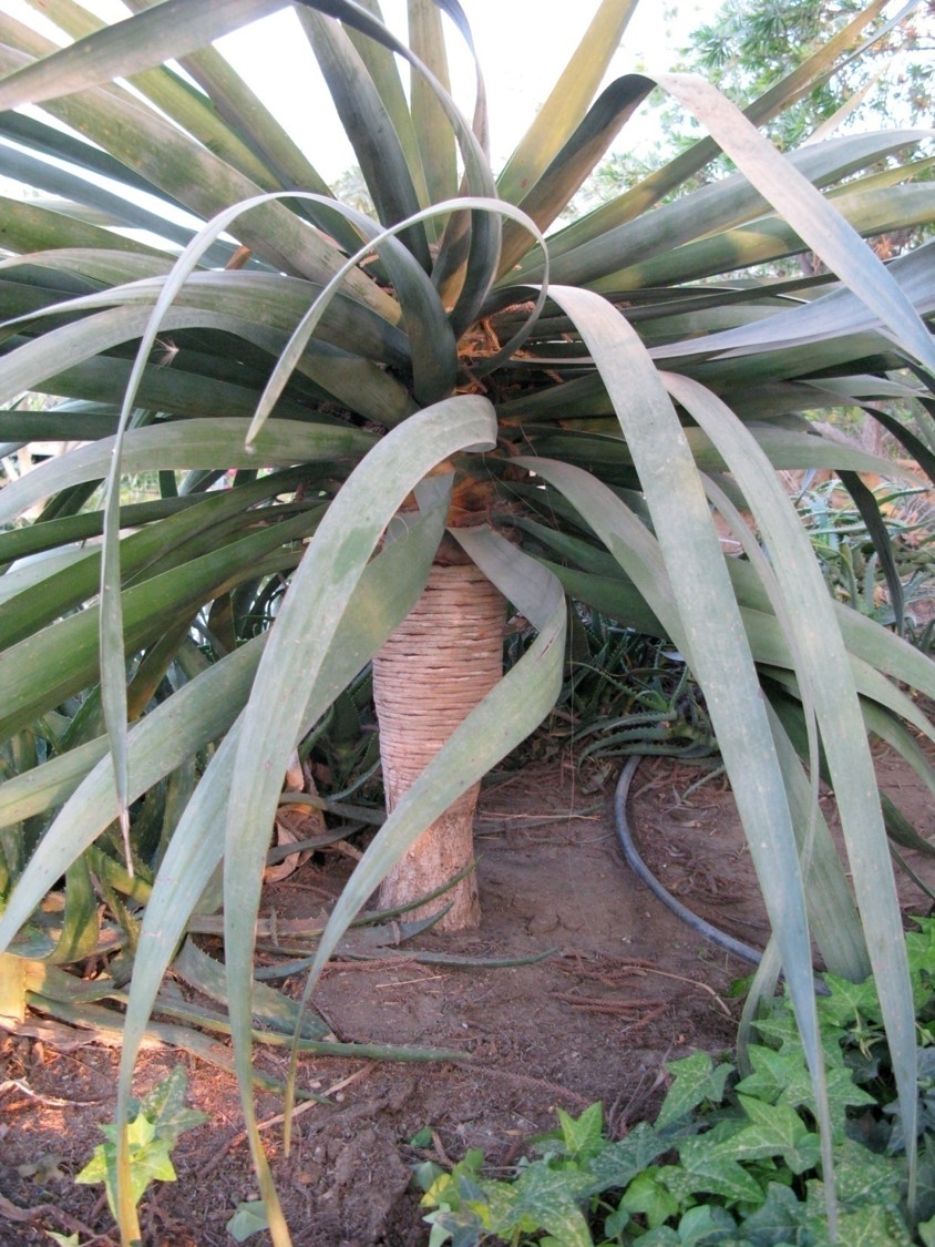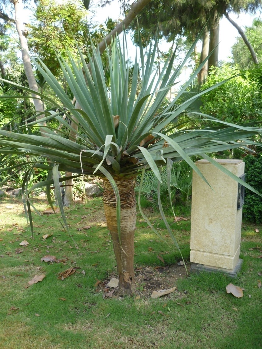 Evergreen  tree with a dense crown, growing about 9 m tall The leaves are found only in dense rosettes at the end of its youngest branches and are all shed every 3 or 4 years before new leaves simultaneously mature The leaves are long, stiff , 30 to 60 cm long and 2-3 cm wide flowers white or green fruits berries,  small fleshy  containing between 1 and 3 seeds As they develop they turn from green to black and then become orange once they are ripe