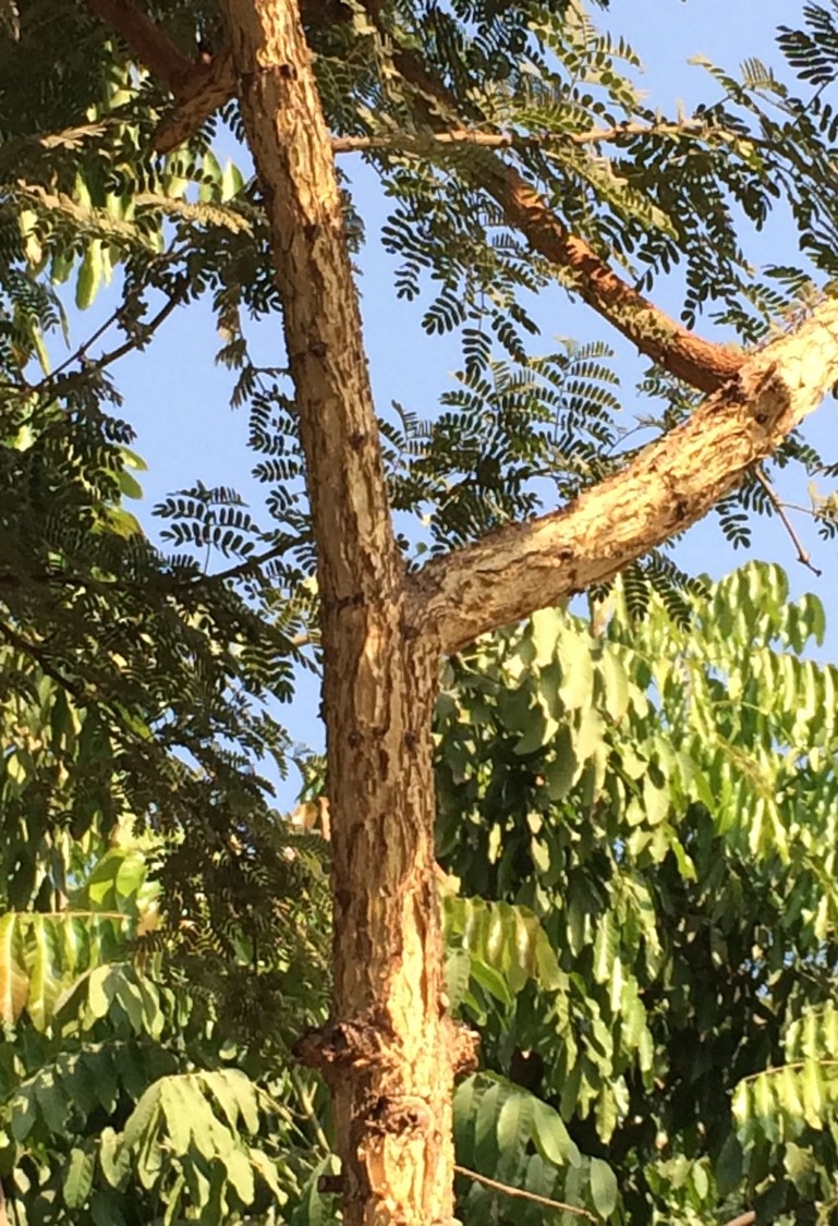 Medium to large deciduous tree 8-30 m high trunk prickles in opposite pairs, short, broad and hooked leaves bipinnate flowers in long slender spikes, cream to pale yellow, the calyces showing red before the flowers open The pods are long, up to 25cm, flat and hairless