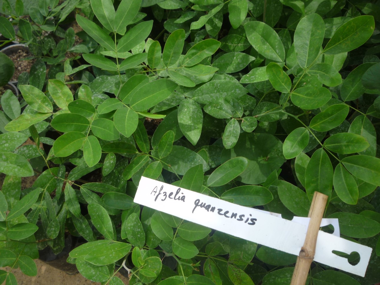 Deciduous tree to 20 m high, leaves glossy dark green, paripinnate with 4-7 pairs of opposite leaflets flower with a single petal, pinkish-red with yellow veining fruit flattened pod, thickly woody, 10-17 cm, shiny black seeds with a bright red aril