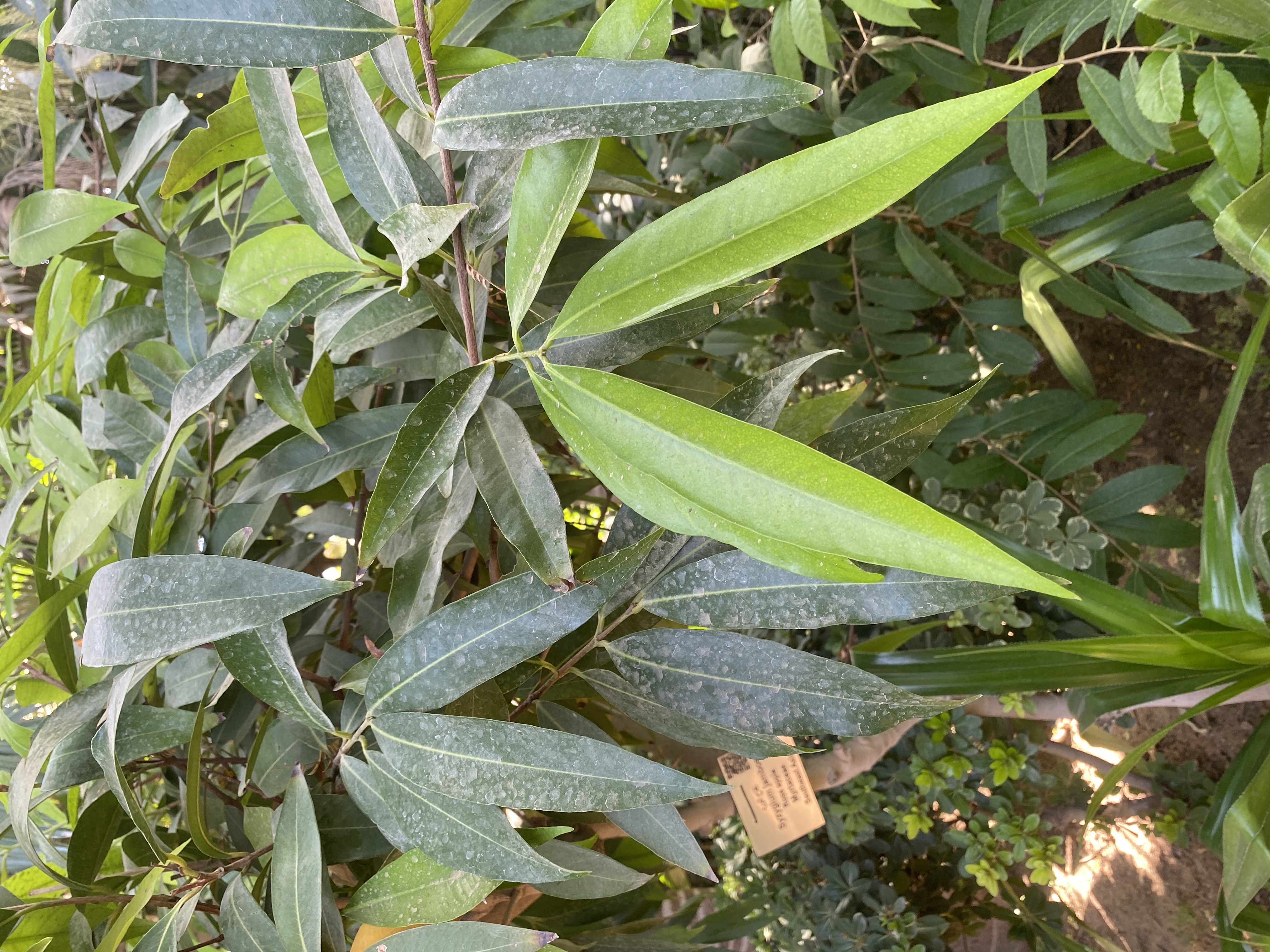 Evergreen small tree to 5-15 m tall leaves lanceolate, 10-20 cm long, 2-4 cm wide, pointed, base cuneate flowers in small terminal cluster, white or greenish white fruit drupe,  like the guava, fragrans, containing 1-2 seeds
