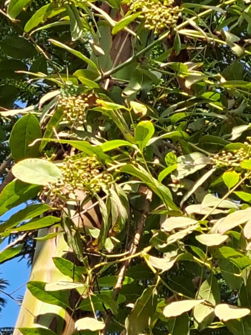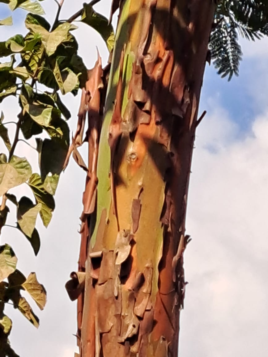 Evergreen tree, fast-growing, very large to 75 m high in mature, 18 m wide Trunk smooth  orange-tinted trunk bark which peels in summer to reveal a unique and sometimes stunning multi-colored bark, consisting of streaks of pale green, red, orange, gray and purple-brown leaves aromatic, ovate to lanceolate flowers tiny white in axillary or terminal panicles fruits  small, capsule, mature fruits furn from brown to dark brown, containing 3-12 well-formed seeds per valve, seeds tiny, brown, flattened, with a small terminal wing